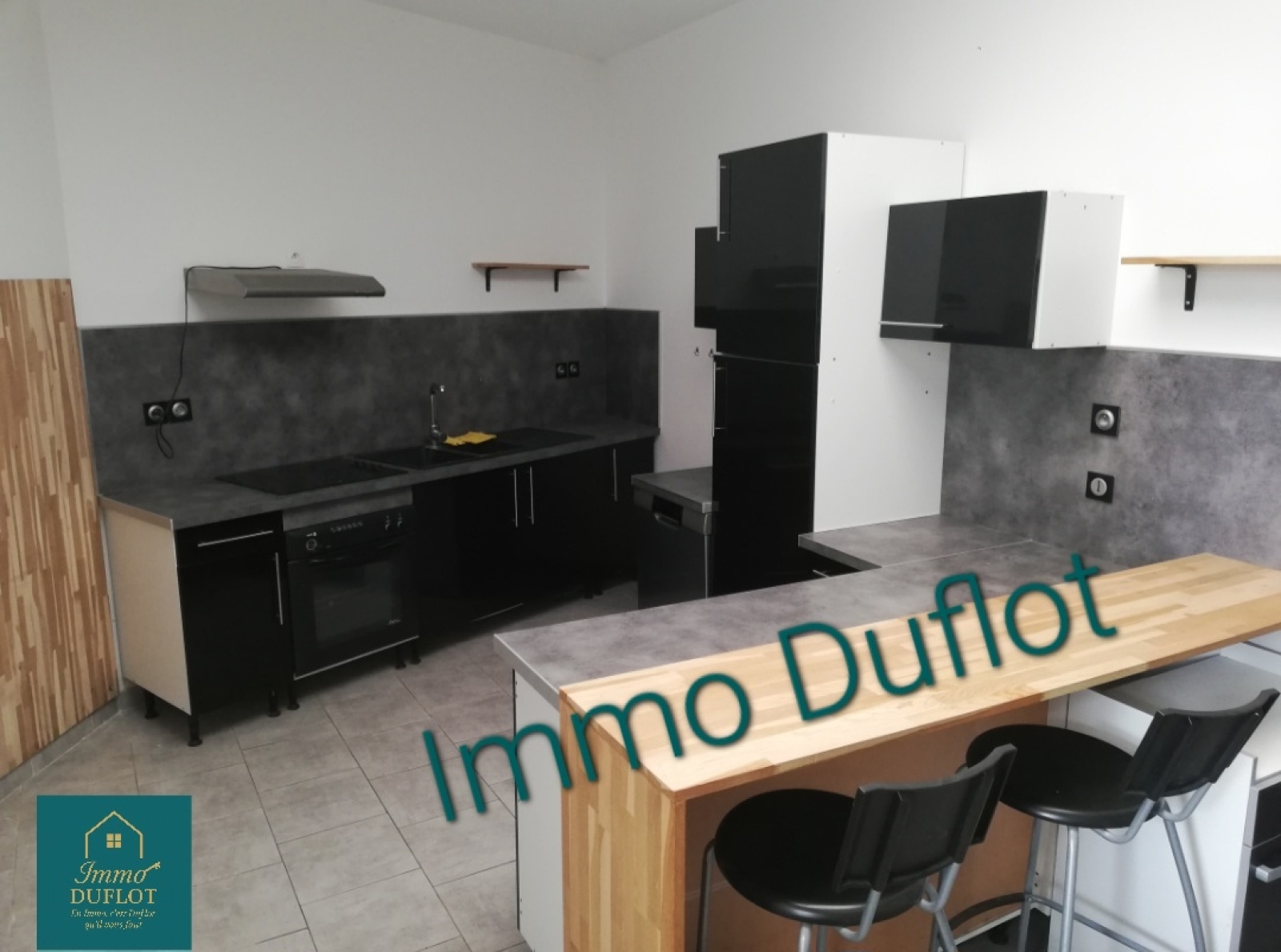 Rez de chaussée avec séjour, cuisine meublée, buanderie, wc et salle de bains.